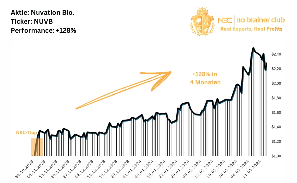 Kurz nach der Vorstellung von Nuvation Bio konnten sich NBC-Mitglieder die Aktie zu 1,00 USD ins Depot legen – um sich nur 4,5 Monate später über satte +128% Kurszuwachs zu freuen.