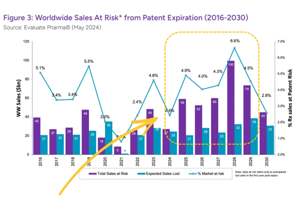 Zudem erwarten Experten in den nächsten Jahren zahlreiche Übernahmen. Der Grund ist simpel: In der Pharmabranche rollt der sogenannte Patent Cliff an. In den Jahren 2025 bis 2030 verlieren viele umsatzstarke Blockbuster ihren Patentschutz, Generika und Biosimilars drücken dann Preise und Marktanteile oft sehr schnell. Für Big Pharma entsteht dadurch eine echte Umsatzlücke (siehe Grafik), die man mit interner Forschung alleine meist nicht schnell genug schließen kann. Genau deshalb steigt der Druck, sich Wachstum extern einzukaufen, also über Übernahmen, Lizenzdeals und Pipeline-Käufe.