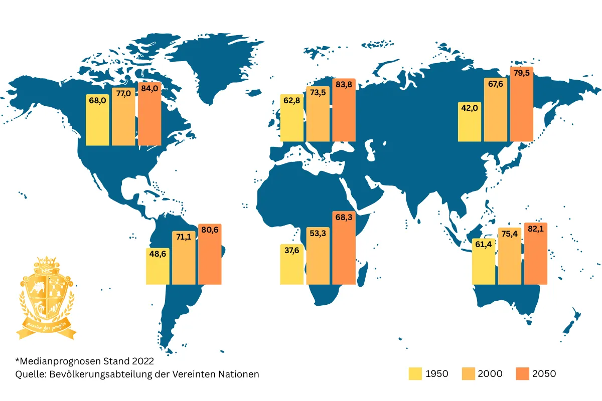 Besonders stark ist der Sprung in Asien, dort wächst die durchschnittliche Lebenserwartung von 42,0 auf 79,5 Jahre. In Afrika steigt sie von 37,6 auf 68,3 Jahre. Europa und Nordamerika bewegen sich Richtung Mitte 80. Heißt unterm Strich: Immer mehr Menschen werden deutlich älter, und das weltweit.