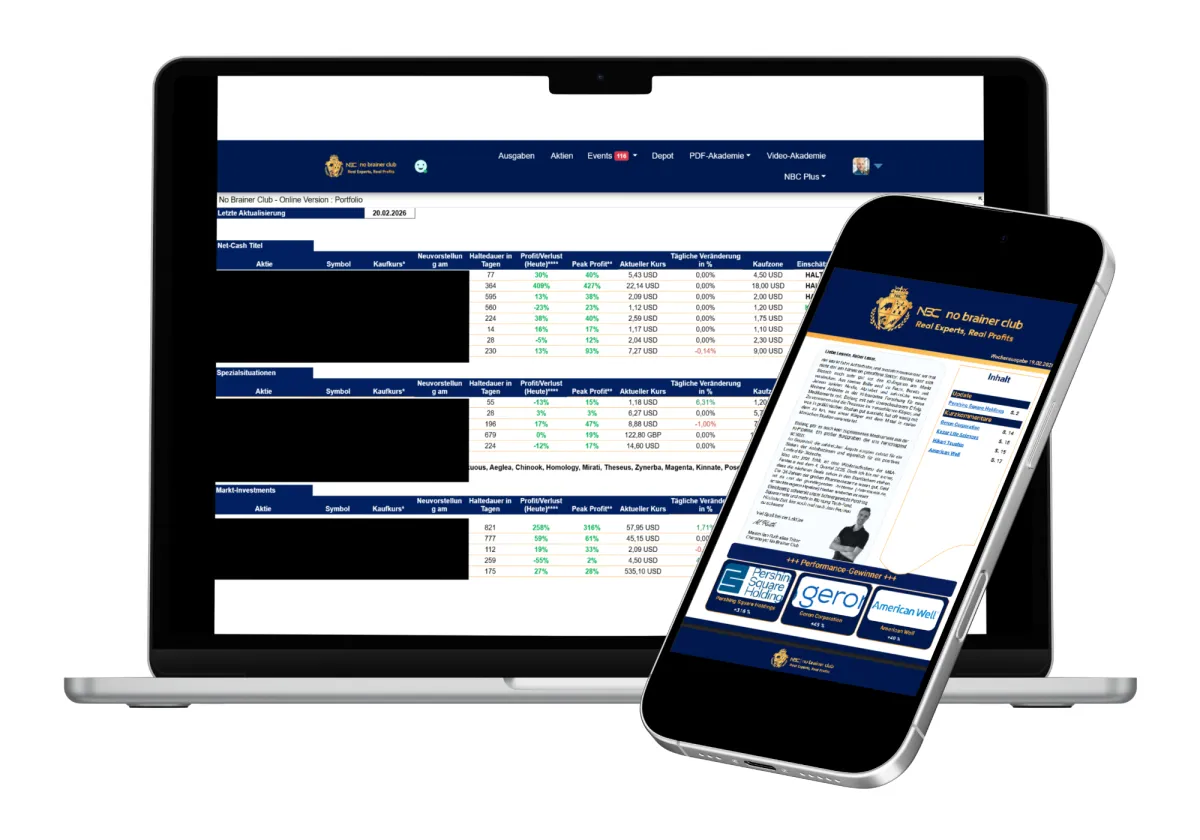 Der No Brainer Club bietet Dir einen umfassenden Mitgliederbereich. Dort findest Du jederzeit das aktuelle Portfolio mit allen Aktientiteln, Portfoliogewichtungen und den jeweiligen Kaufzonen. Zusätzlich stehen Dir alle früheren Ausgaben sowie die Aufzeichnungen der NBC-Live-Sprechstunden zur Verfügung.