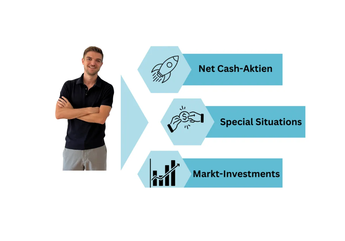 Mit soliden Markt-Investments sichern wir unser Vermögen ab, indem wir auf Gewinner langfristiger Trends setzen. Das Sahnehäubchen bilden die Special Situations: Firmen kurz vor der Liquidierung oder M&A-Zielobjekte versprechen bei höherem Risiko kurzfristige, explosive Renditen im teilweise dreistelligen Bereich. Als Mitglied des No Brainer Club kannst Du dank dieser Strategie in jeder Börsen-Wetterlage von satten Gewinnen profitieren.