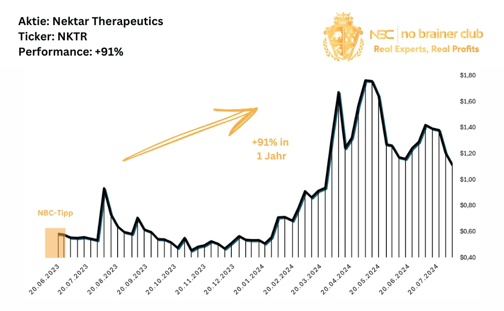 Schöne Kursprünge konnten NBCler mit NKTR feiern, darunter auch einen Trade-Erfolg mit +100% an nur einem Tag! Anlegern, die von Beginn an dabei waren brachte der Tipp insgesamt +91% innerhalb eines Jahres.