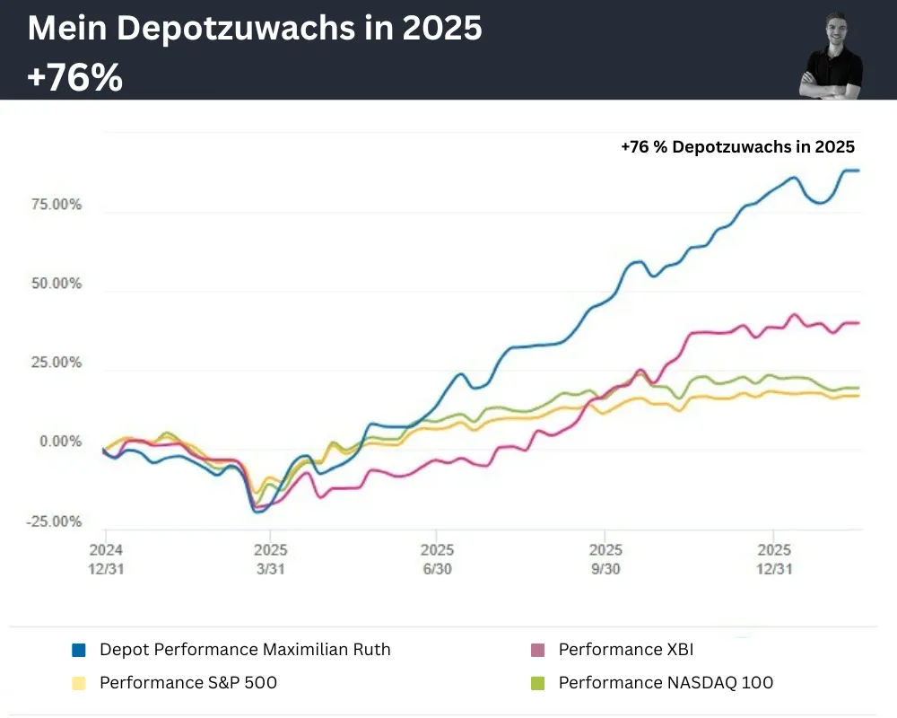 In meinem Depot habe ich damit den Markt deutlich geschlagen. 2024 lag meine Depot-Performance bei +73 Prozent und im Jahr 2025 konnte ich das mit +76 Prozent erneut bestätigen. Die folgenden Performance-Charts aus meinem Depot setzen den Zuwachs in Relation zu bekannten Indizes.