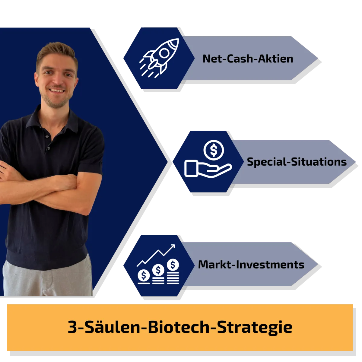 Die 3-Säulen-Biotech-Strategie ist auf Erfolg in jeder Marktlage ausgerichtet. Ob mit Biotech-Raketen, Special Situations oder krisensicheren Marktinvestments – Du fokussierst Dich immer auf Rendite und trauerst keiner verpassten Chance hinterher.